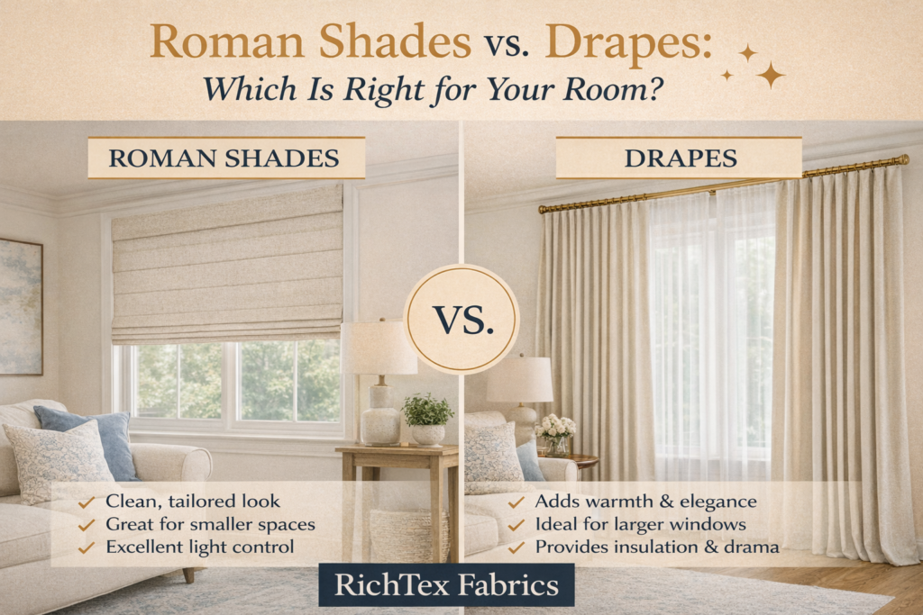 Choosing between Roman shades and drapes depends on your style, space, and how you use the room. Both are beautiful custom options, but they serve slightly different purposes.